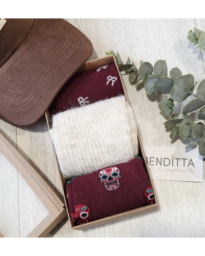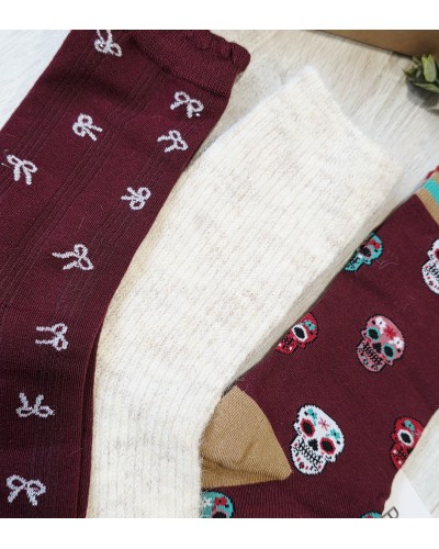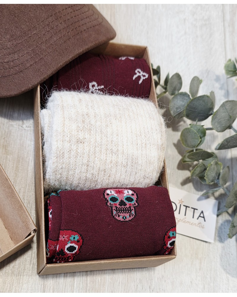 Pack de 3 calcetines de máxima calidad con diferente estampados en tonos burdeos, beige, con calaveras..