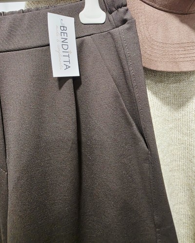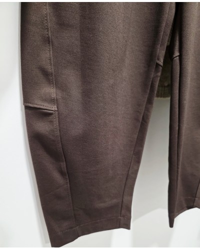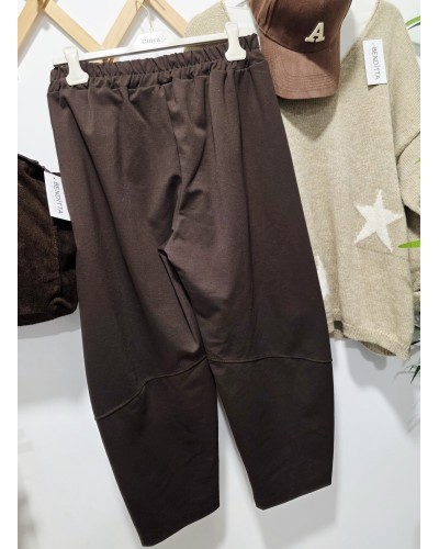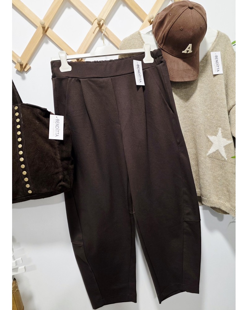 Pantalón de tiro medio en color marrón chocolate. Cintura elástica, bolsillos laterales. Pernera ancha, corte balloon.