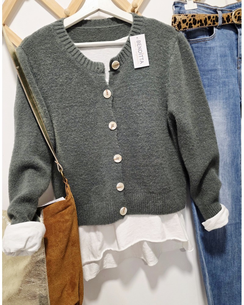 Chaqueta abotonada en color marrón verde medio. Muy suaves y gustosas. Botones de pasta en parte frontal para su cierre.