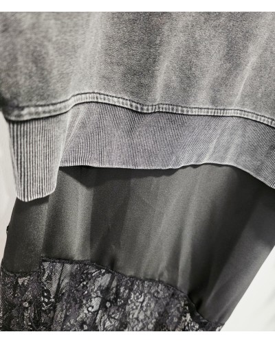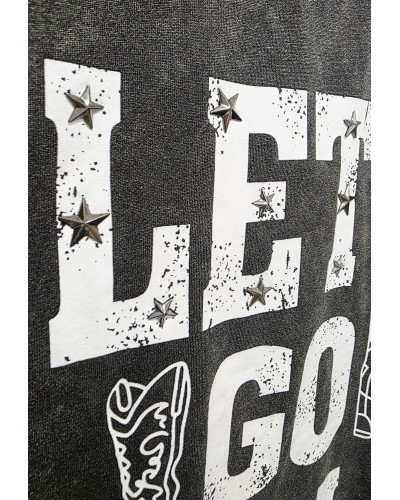 Sudadera en color gris lavado, son larguitas. Con estampado frontal de texto y dibujo en blanco y tachas de estrellas en plateado. Cuello redondo. Manga larga.