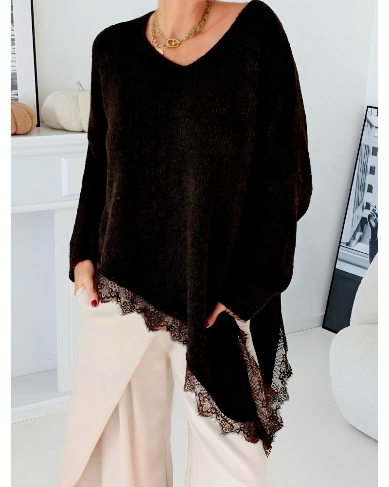 Maxi Jersey de punto en color negro. Cuello pico y manga larga. Bajo asimétrico bordeado con puntilla en el mismo tono. Más largo por un lateral acabado en pico.