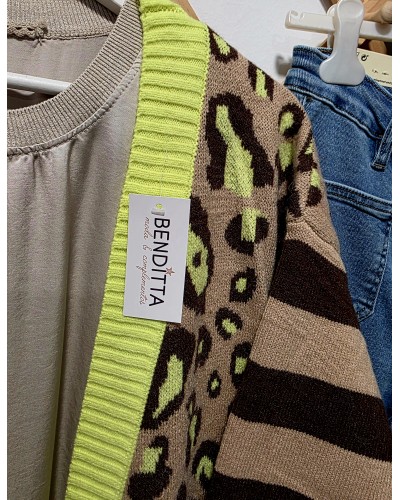 Chaqueta de punto largo 3 /4. Con estampado animal print y rayas en tonos marrón, tostado y amarillo flúor. Bolsillos delanteros. No se atan.