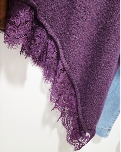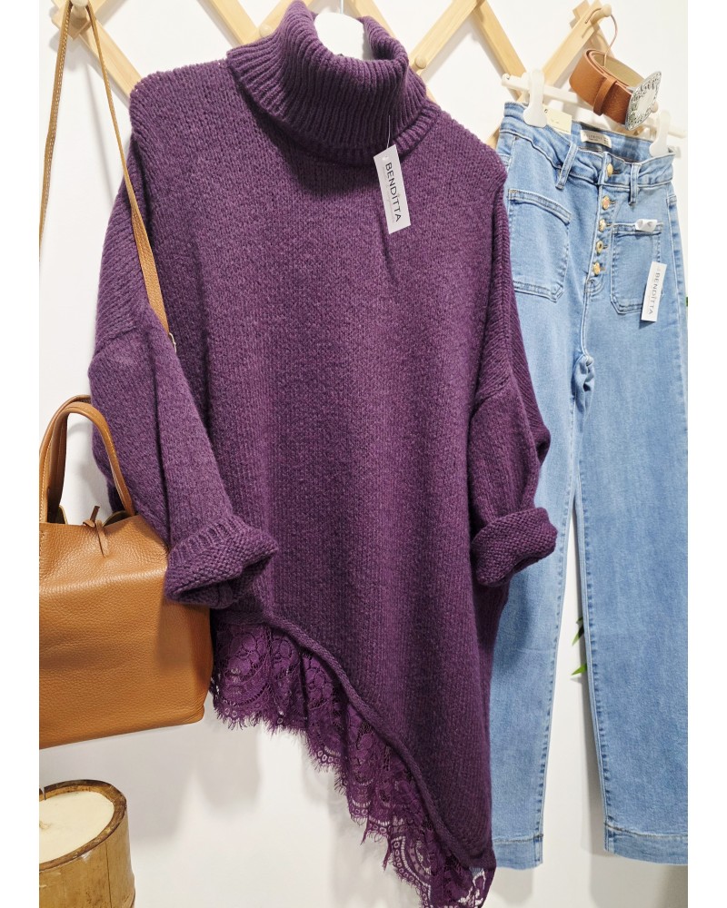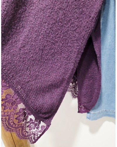 Maxi Jersey de punto en color púrpura / morado oscuro, Cuello vuelto y manga larga. Bajo asimétrico bordeado con puntilla en el mismo tono. Más largo por un lateral acabado en pico.