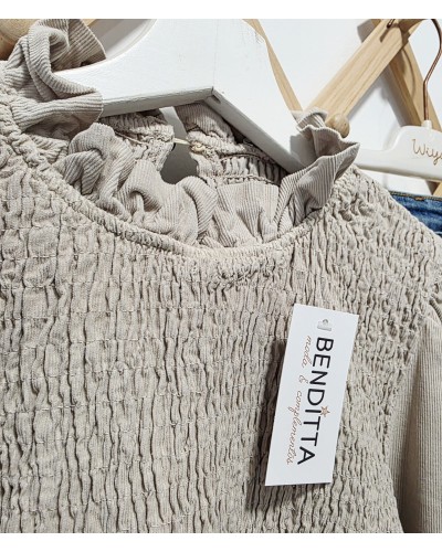 Blusa de micropana en color beige. Parte superior y puños fruncidos. Bajo acabado en volante. De meter por la cabeza y con botón en cuello de la parte trasera. Estiran un poquito.