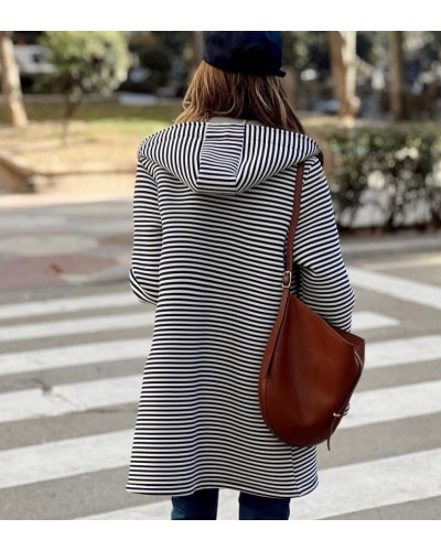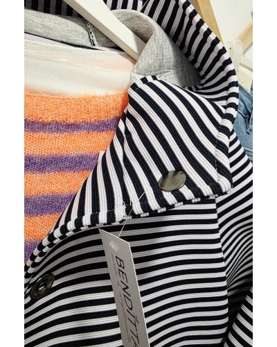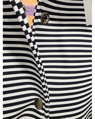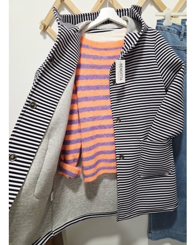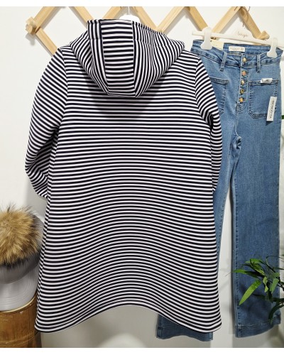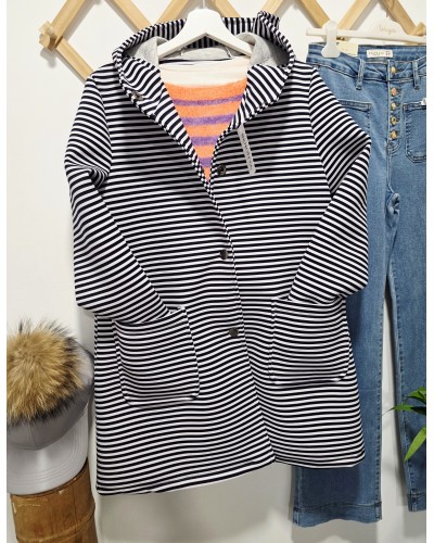 Chaquetón tipo neopreno con estampado de rayas en azul marino / blanco e interior gris. Con capucha, corchetes en parte delantera para su cierre y bolsillos. Corte recto. Son un poco elásticos