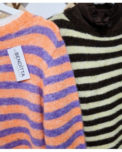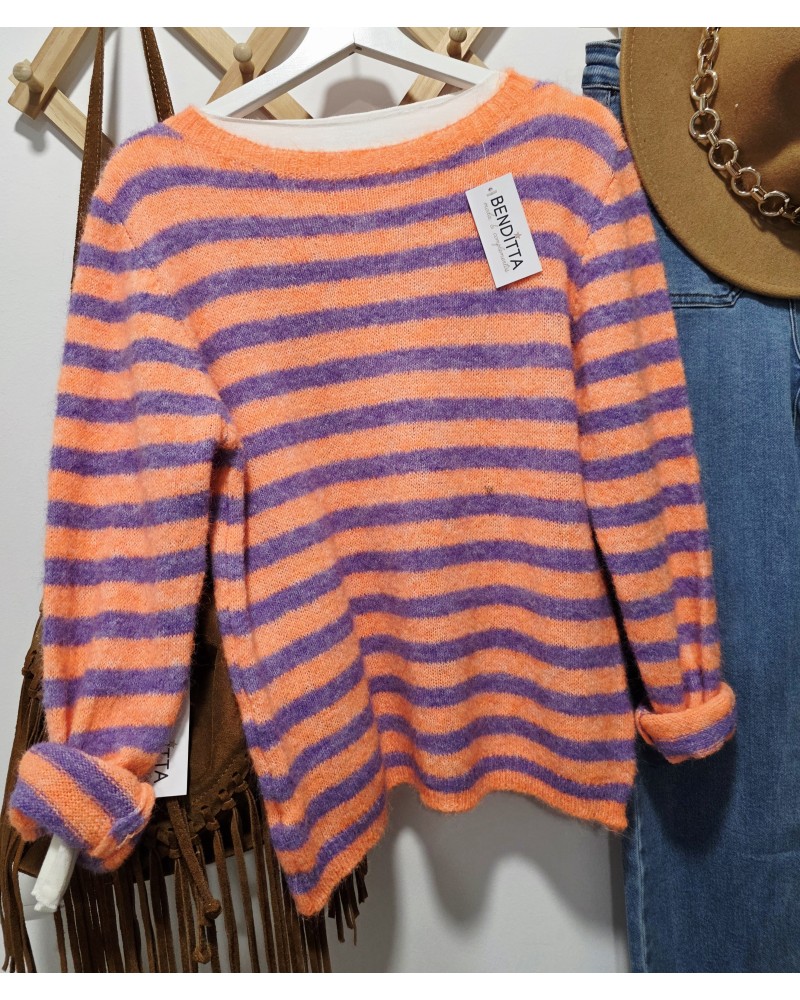 Jersey de punto muy suave y estampado de rayas en colores naranja y morado. Cuello redondo. Manga larga.