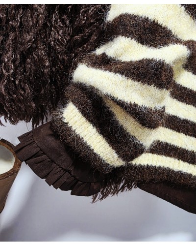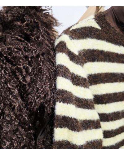 Jersey de punto muy suave y estampado de rayas en colores marrón y amarillo pastel. Cuello redondo. Manga larga.