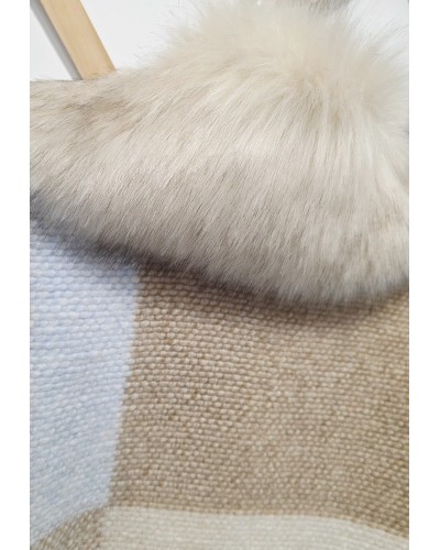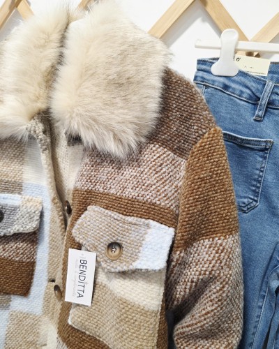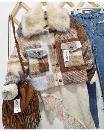 Chaquetón corto de lana con estampado de cuadros en tonos camel, azul, tostado, beige...Cuello efecto pelo suave y abundante que no se quita. Con botones delanteros para su cierre y bolsillos. Con forro en su interior. La posición y el tamaño de los cuadros es aleatoria, no hay dos iguales!!