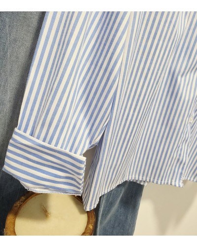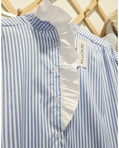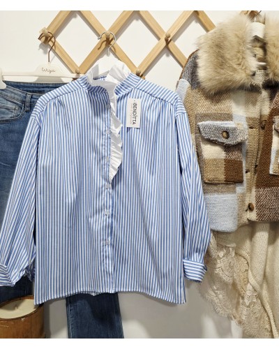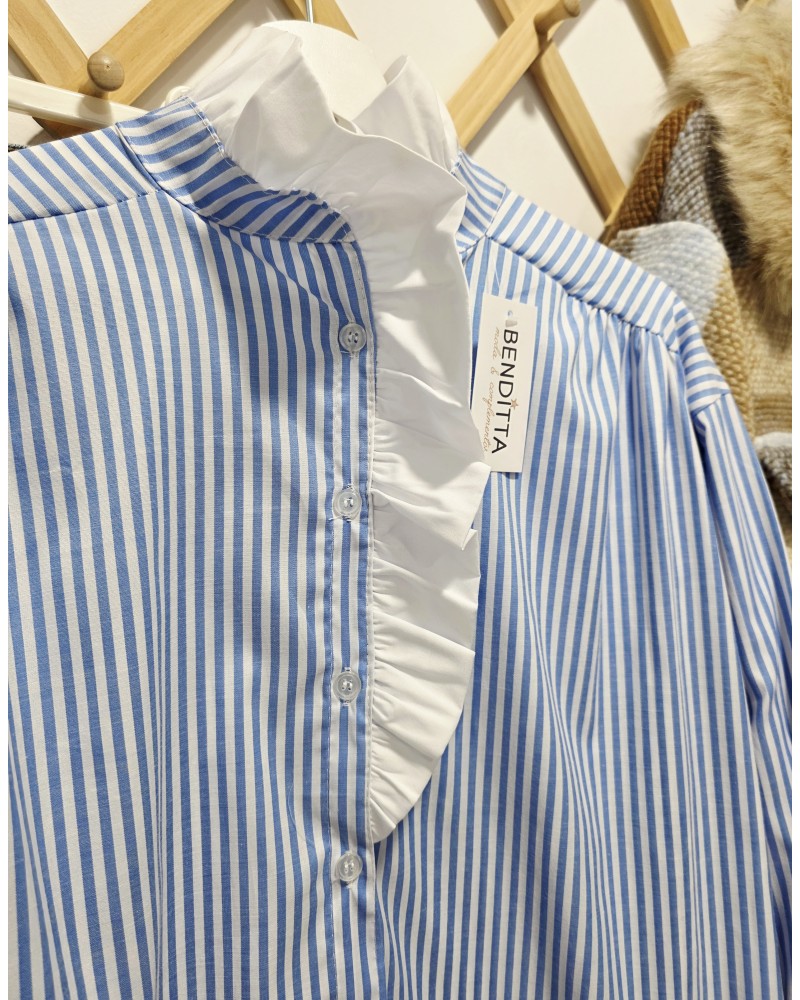 Blusa de popelín con estampado mil rayas en azul / blanco. Abotonada en parte delantera y puños. Cuello mao en color blanco y con volante.