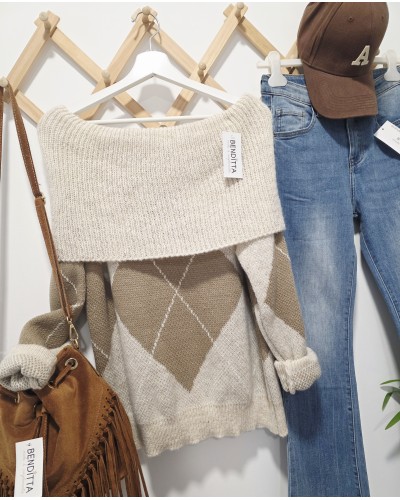 Jersey de punto en tono beige. Escote bardot con estampado de rombos en tostados. Muy suaves y calentitos.
