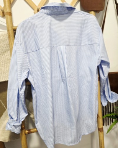 Blusa con estampado mil rayas en azul / blanco. Abotonada en parte delantera. Con osito en tonos camel bordado. Más larguitos por detrás.
