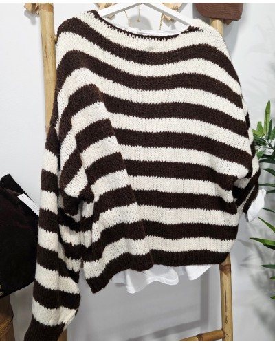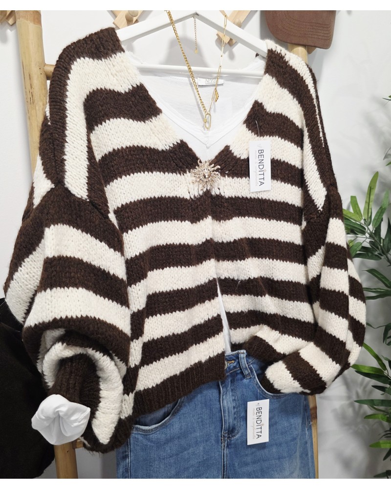 Chaqueta amplia de punto con estampado de rayas en beige y marrón chocolate. Mangas holgadas. Lleva broche de sol en dorado que se puede quitar y reutilizar en otras prendas.