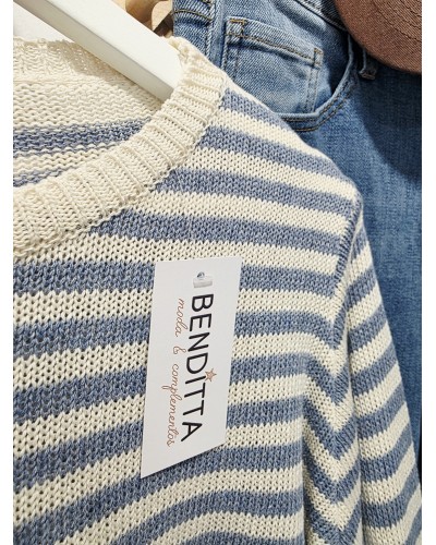Jersey de punto fino con estampado de rayas en color beige y azul vaquero. Cuello redondo. Bajo, cuello y puños ribeteado en beige.