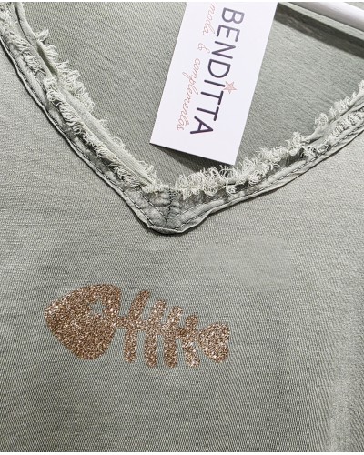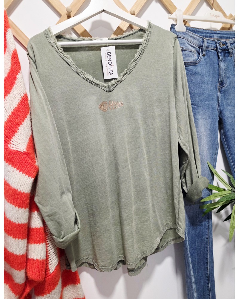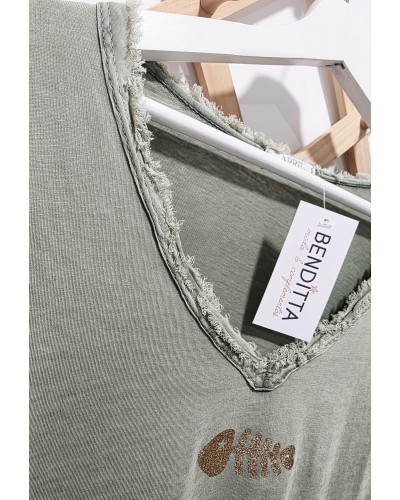 Camiseta de manga larga en color verde caqui. Con detalle de dibujo de raspa en dorado en parte delantera. Cuello pico deshilachado.
