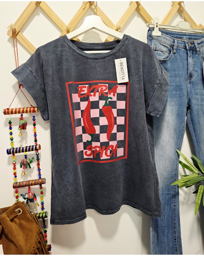 Camiseta en color gris lavado con cuello redondo y media manga recogida. Detalle de dibujo y texto impreso en parte delantera en tonos rojo, rosa, y verde.