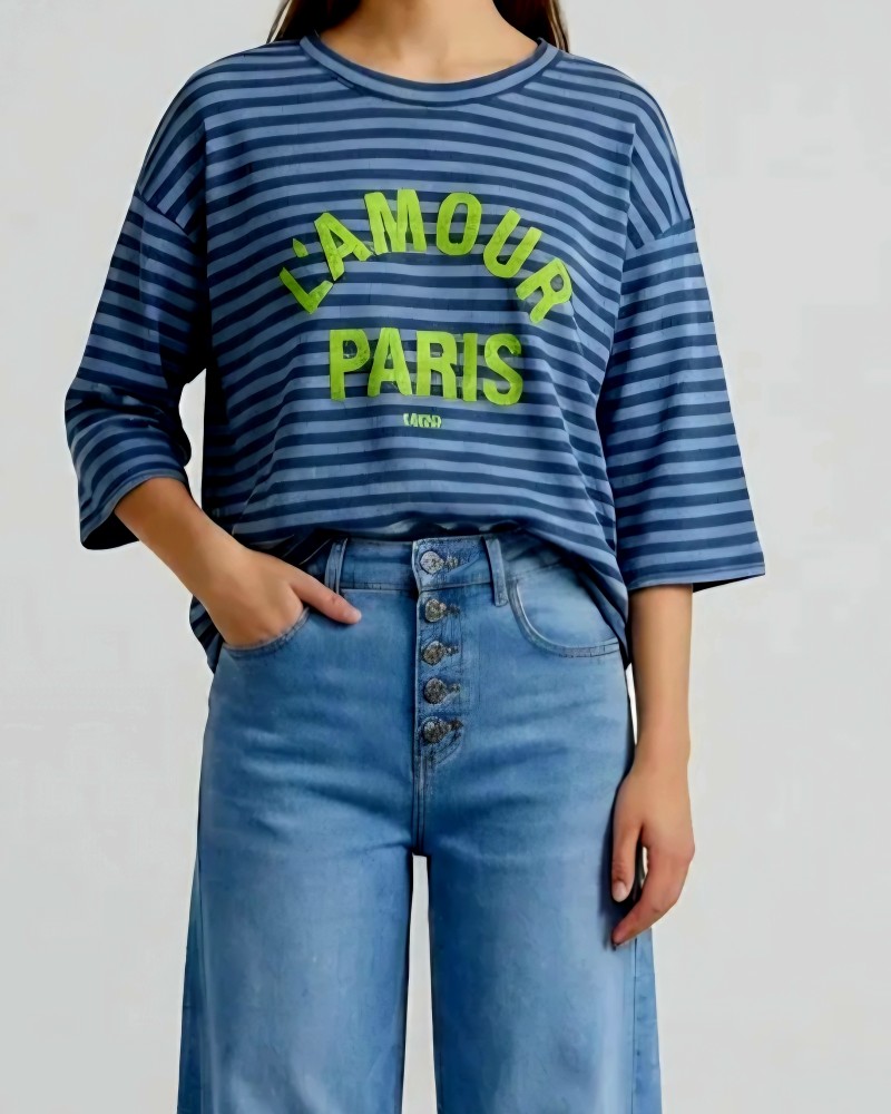 Sudadera con manga 3 / 4 y estampado de rayas en tonos azules. Cuello redondo. Con texto en textura en color amarillo flúor en parte delantera.