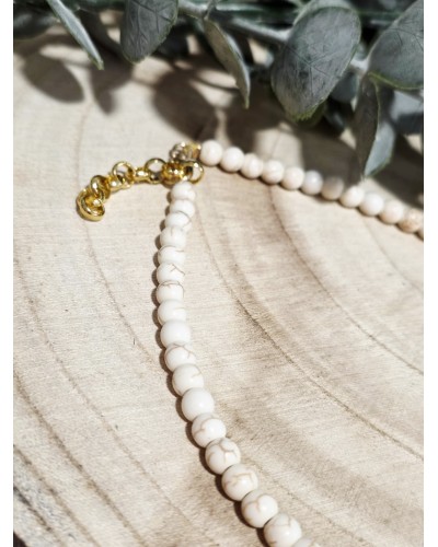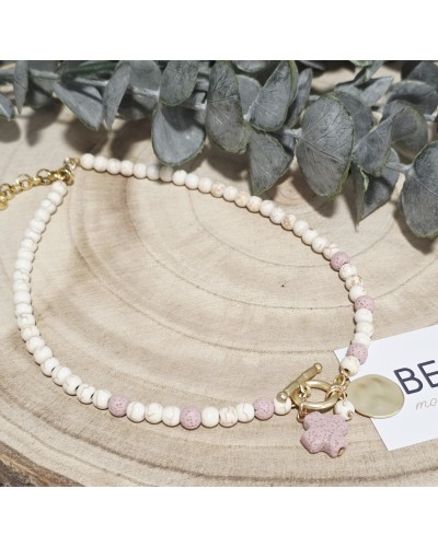 Collar de cuentas en color beige y rosa. Cierre metálico dorado ajustable. Colgante de cruz, piedra y medalla lisa en color dorado.
