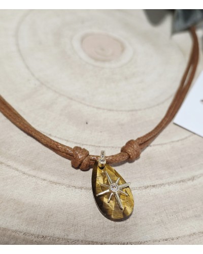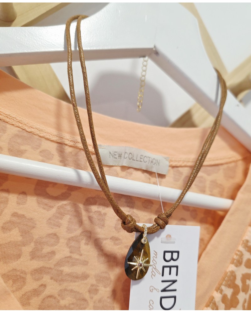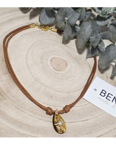 Collar de cordón de cuero en color camel. Cierre trasero metálico en color dorado. Detalle de piedra en los mismo tonos con estrella dorada engarzada. Regulables.