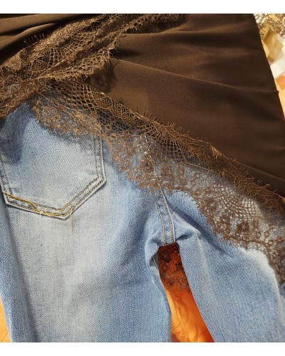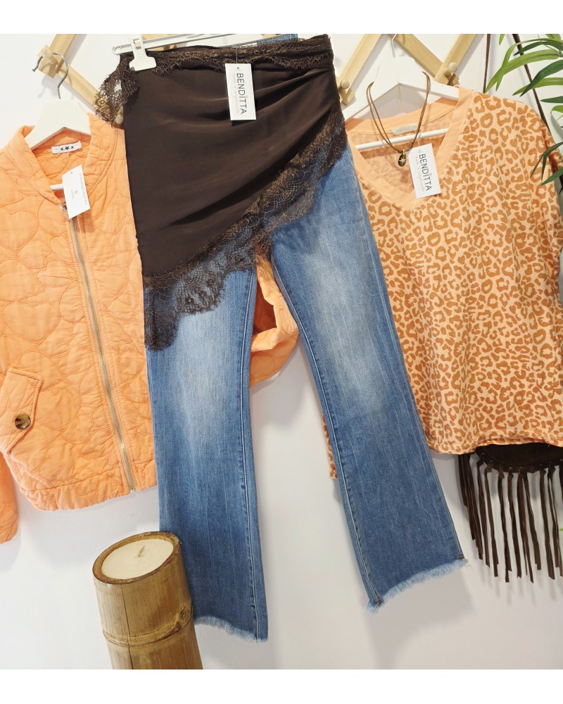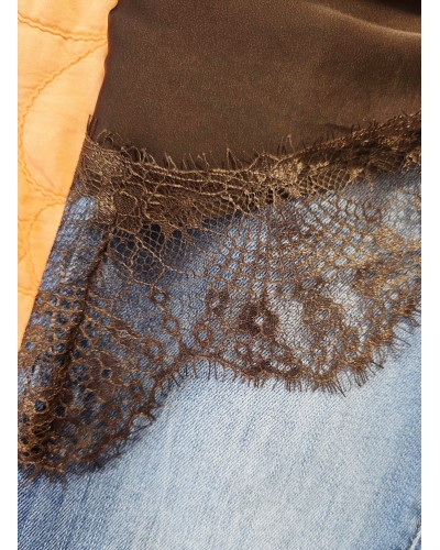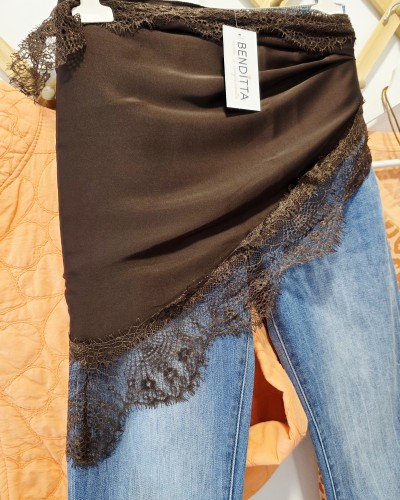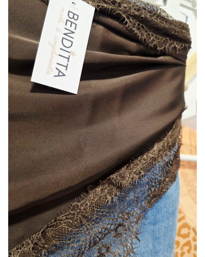 Pañuelo satinado en color marrón chocolate acabado en puntilla al tono. Forma triangular para llevar a la cadera, hombros, atado en bolsos, al cuello...
