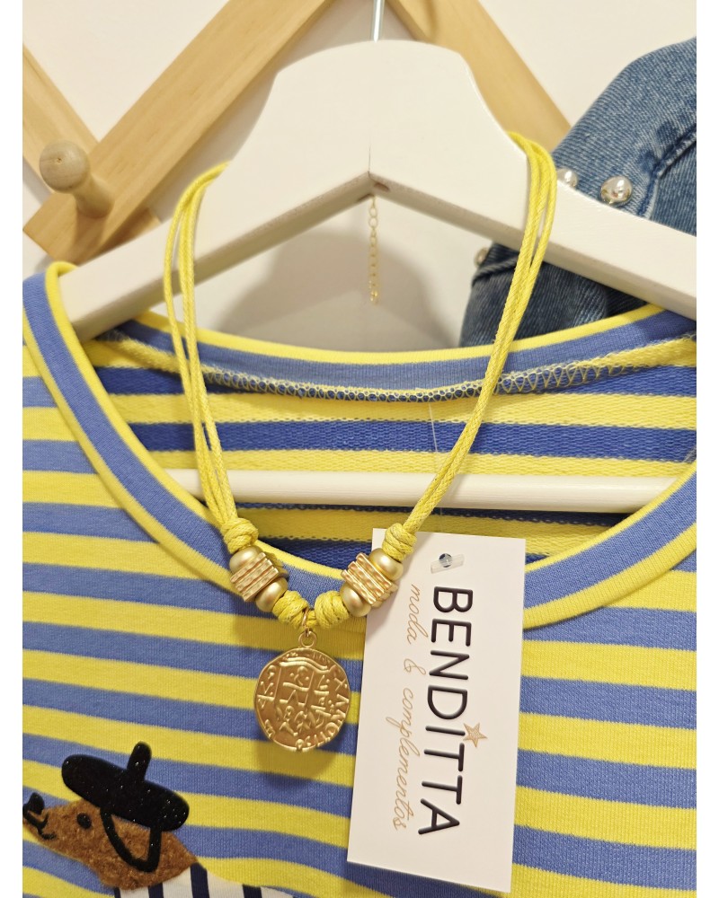 Collar de cordón en color amarillo con nudos ajustables. Colgante de moneda dorada. Cierre trasero con enganche metálico