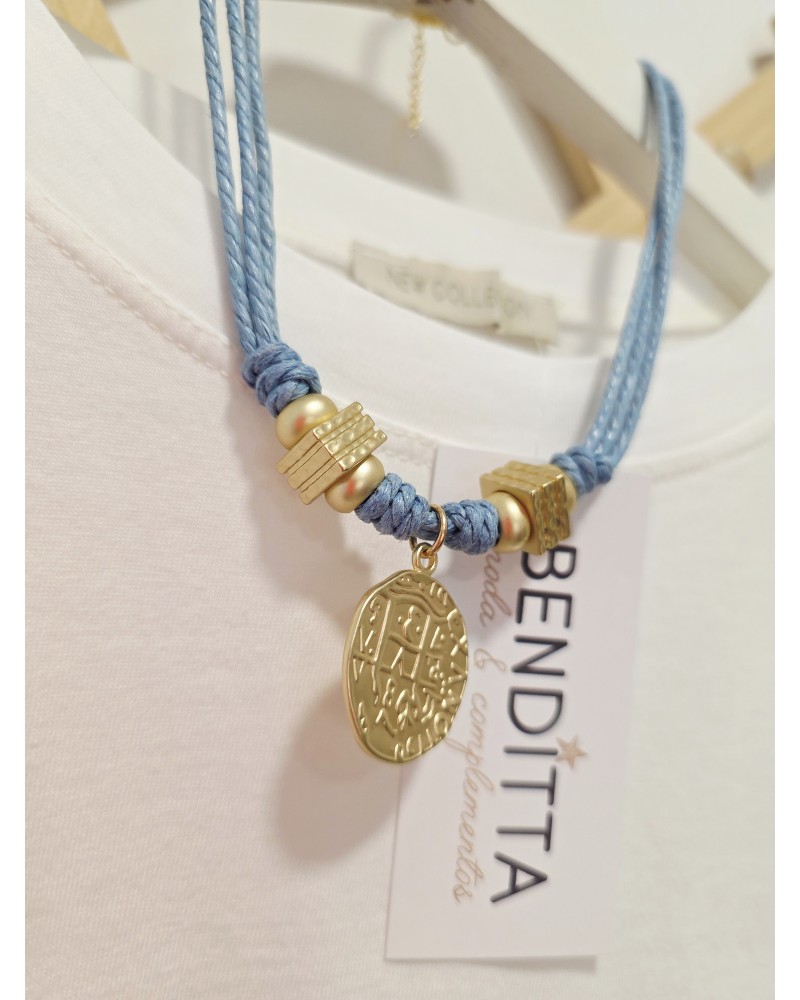 Collar de cordón en color azul con nudos ajustables. Colgante de moneda dorada. Cierre trasero con enganche metálico