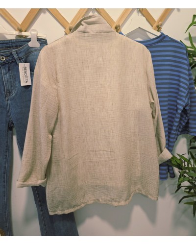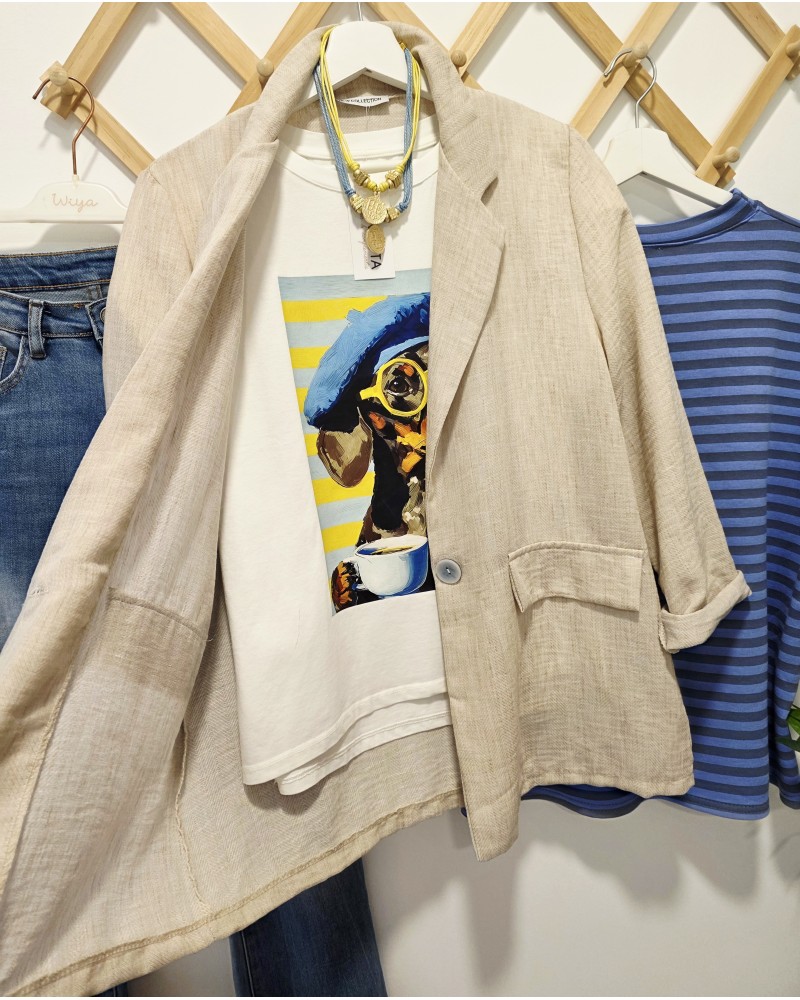Chaqueta corte blazer de tejido fino en color arena. Estampado tipo espiga. Con botón central delantero para su cierre. Cuello solapa. Mangas recogidas.