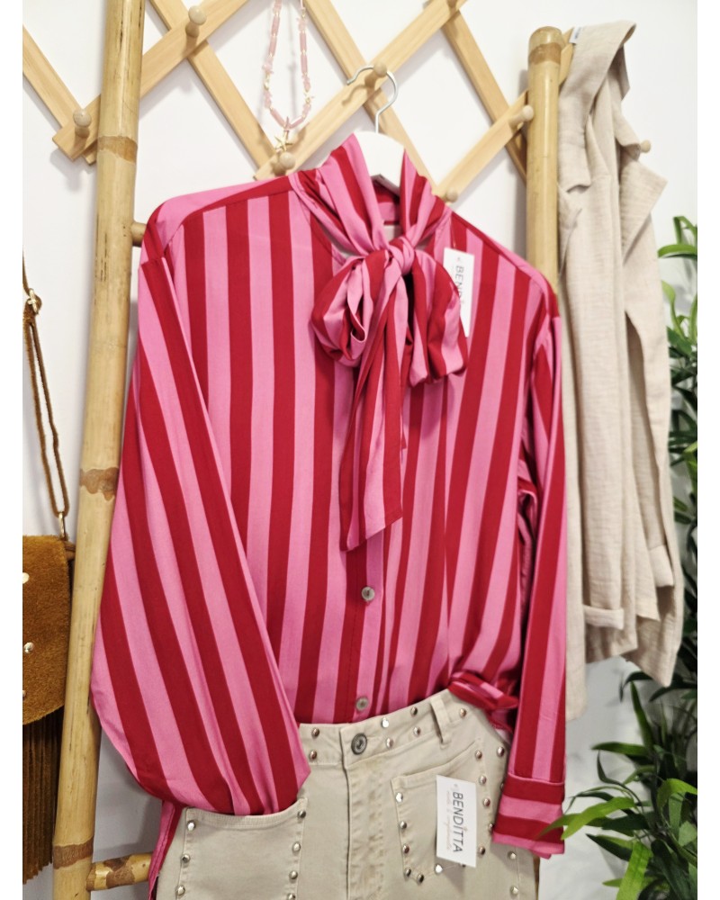 Blusa abotonada en parte frontal con cuello subido y lazada de gran tamaño. Estampado de anchas rayas en colores rojo / rosa. Puños con botón. Más larguitas por detrás, quedan holgadas.