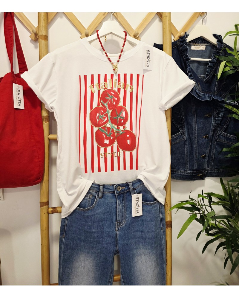 Camiseta de algodón en color blanco. Cuello redondo, manga corta. Detalle en parte frontal de dibujo de tomates en color rojo sobre fondo de rayas en rojo. Texto en dorado.