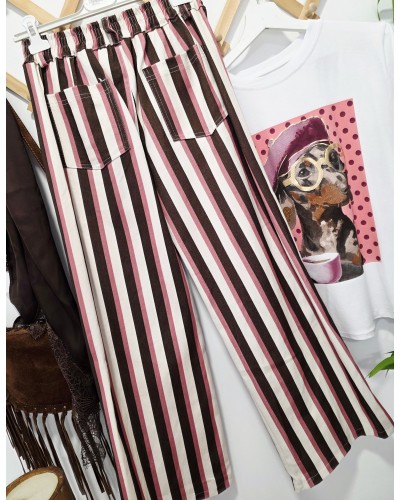 Pantalones con tejido vaquero suave. Estampado de rayas verticales en tonos marrón chocolate, crudo y rosa. Con botón y cremallera para su cierre y trasera elástica que se ajusta a varias medidas. Bolsillos delanteros y traseros. Corte recto anchito.
