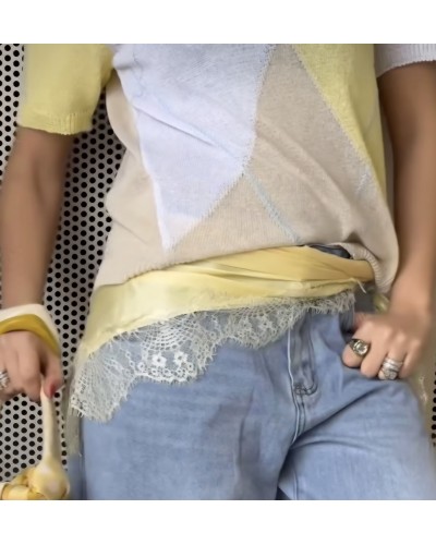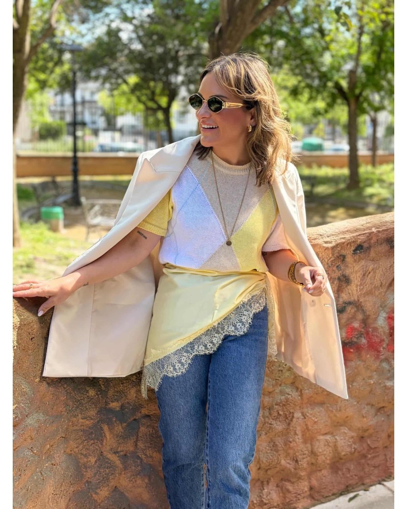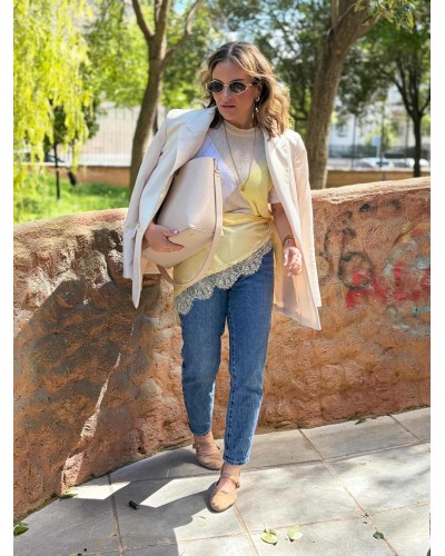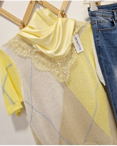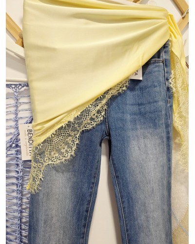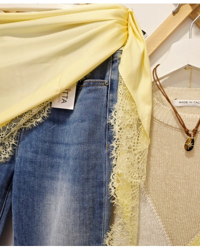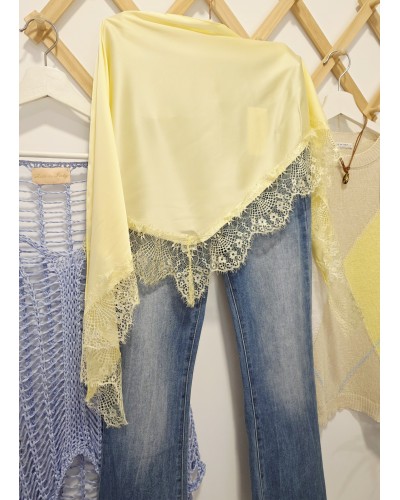Pañuelo satinado en color amarillo pastel acabado en puntilla al tono. Forma triangular para llevar a la cadera, hombros, atado en bolsos, al cuello...