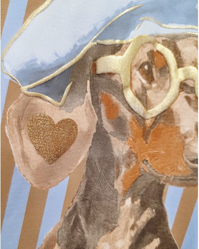 Camiseta de algodón en color blanco. Cuello redondo, manga corta. Detalle en parte frontal de dibujo de teckel sobre fondo de rayas en celeste y marrón. Detalles en dorado.