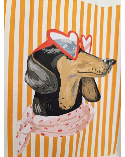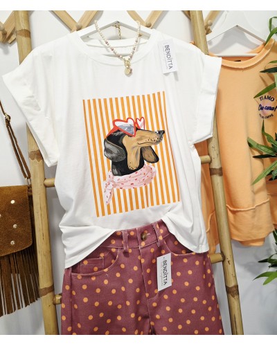 Camiseta en color blanco con cuello redondo y media manga recogida. Detalle de dibujo de teckel con gafas corazón en rojo sobre fondo de rayas en tonos naranjas, rosa, rojo..