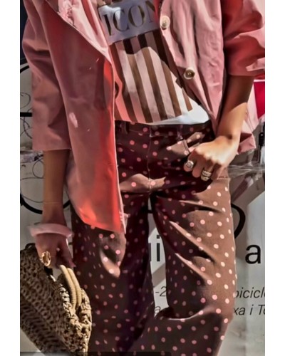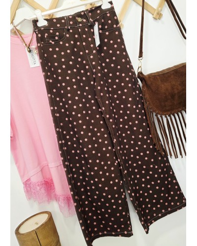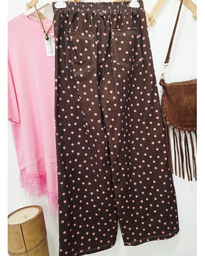 Pantalones con tejido vaquero suave. Estampado de lunares en color rosa y fondo en marrón. Con botón y cremallera para su cierre y trasera elástica que se ajusta a varias medidas. Bolsillos delanteros y traseros. Corte recto anchito.
