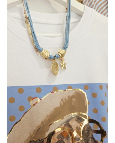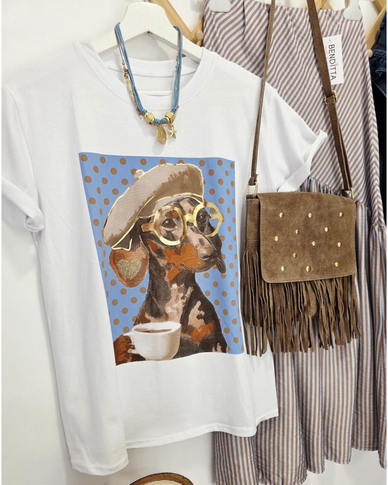 Camiseta de algodón en color blanco. Cuello redondo, manga corta. Detalle en parte frontal de dibujo de teckel sobre fondo azul celeste con lunares en marrón. Detalles en dorado.
