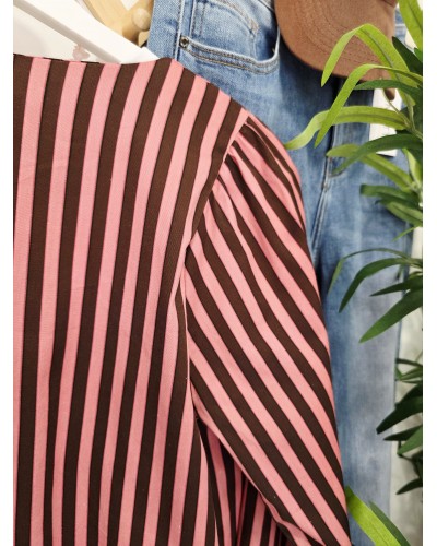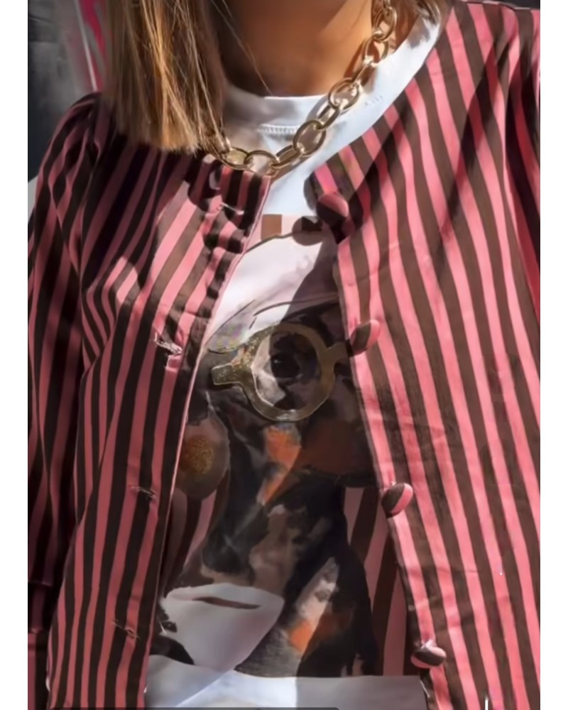Chaqueta con estampado de rayas en rosa y marrón chocolate. Tejido tipo popelín. Cierre frontal con botones forrados en el mismo tejido al igual que en los puños. Manga un poquito abullonada en hombro. Disponemos de pantalón a juego.