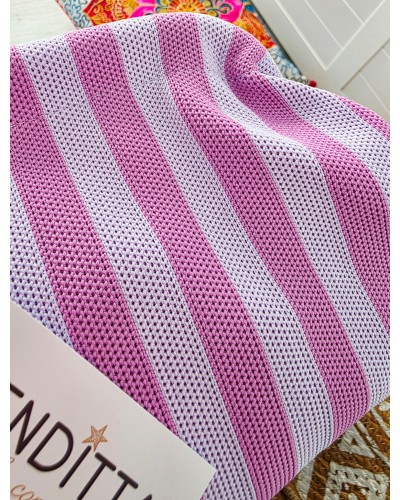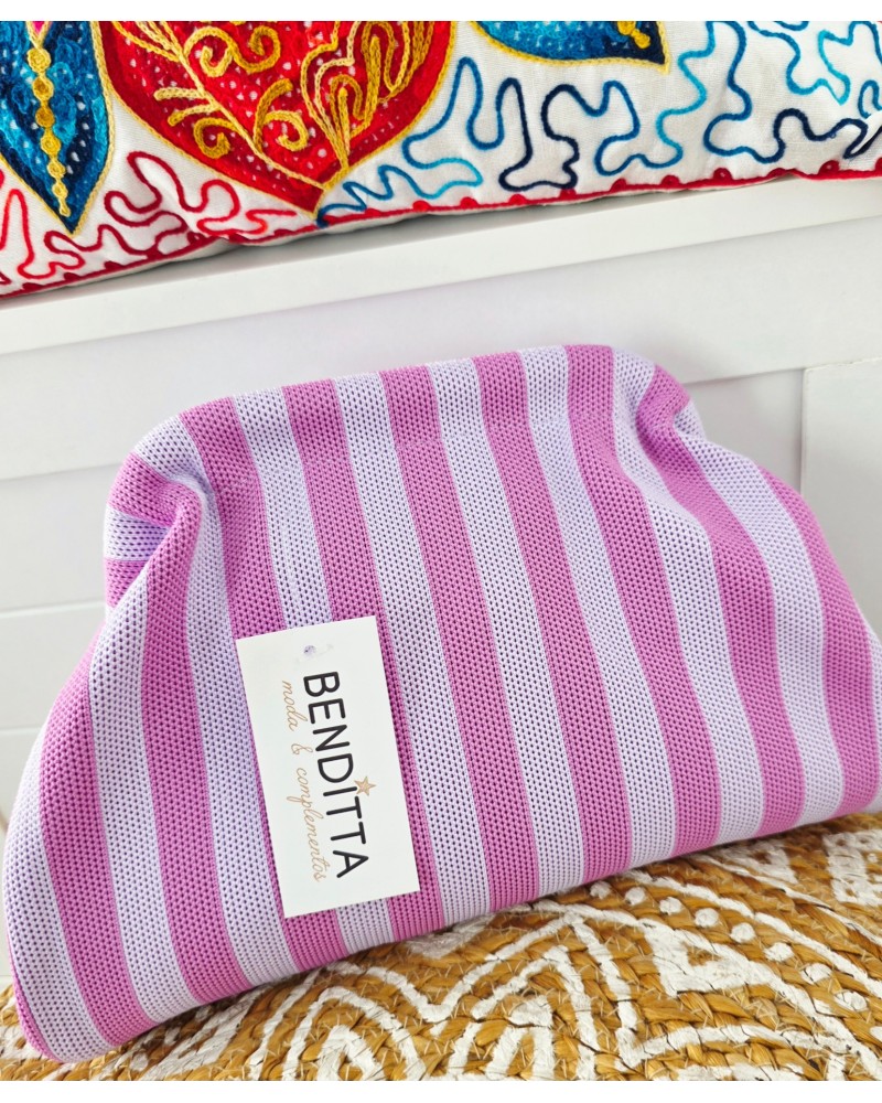 Bolso tejido con estampado de rayas en tonos malva. Cierre a presión para llevar de mano. Incluye cadena larga dorada para llevar también colgado.