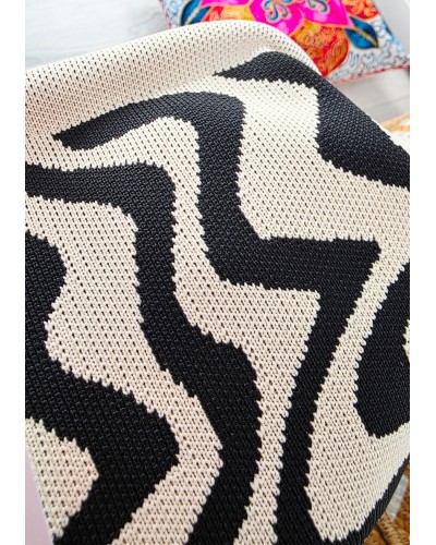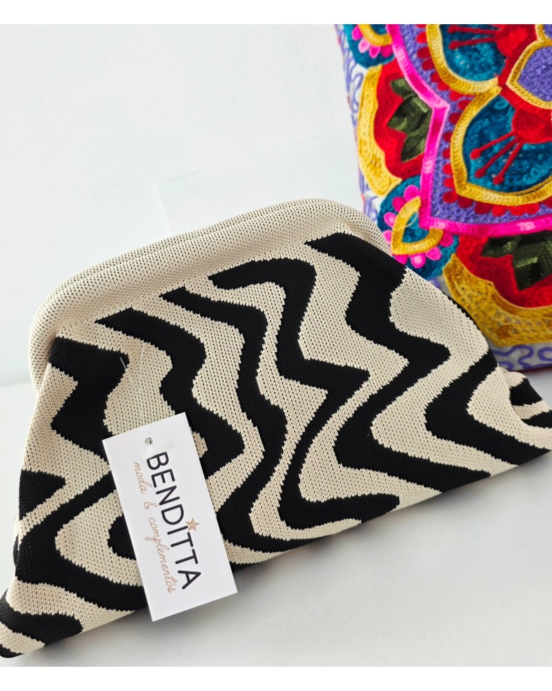 Bolso tejido con estampado de dibujos geométricos en negro / tostado. Cierre a presión para llevar de mano. Incluye cadena larga dorada para llevar también colgado.