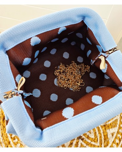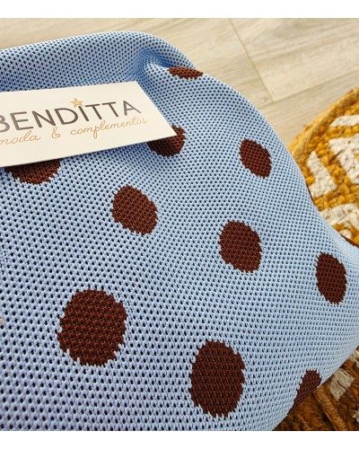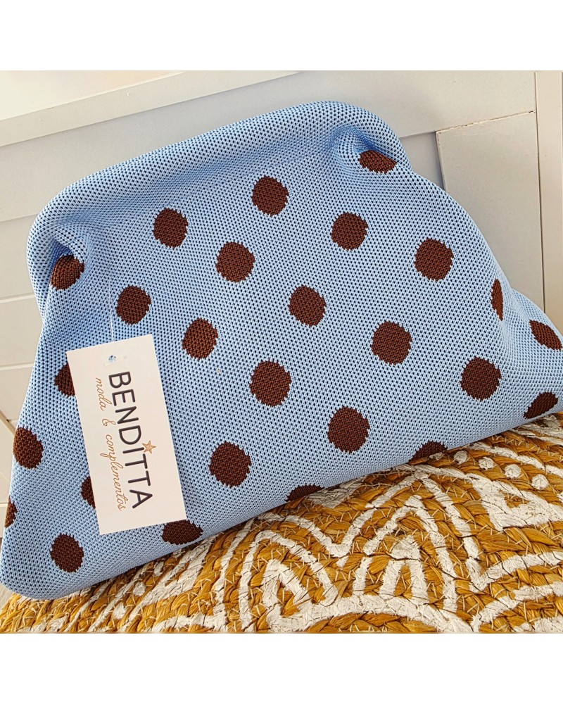 Bolso tejido en color celeste con estampado de lunares en marrón. Cierre a presión para llevar de mano. Incluye cadena larga dorada para llevar también colgado.