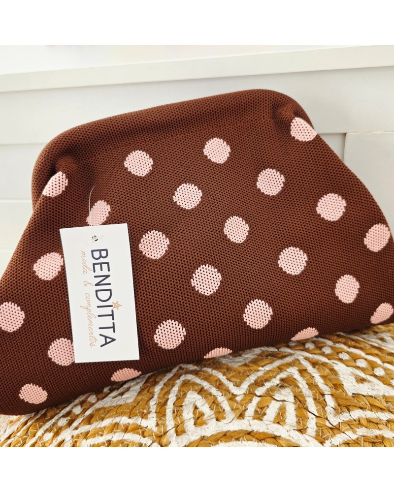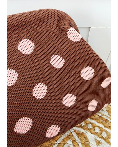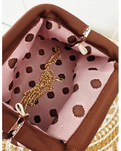 Bolso tejido en color marrón con estampado de lunares en rosa. Cierre a presión para llevar de mano. Incluye cadena larga dorada para llevar también colgado.