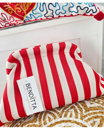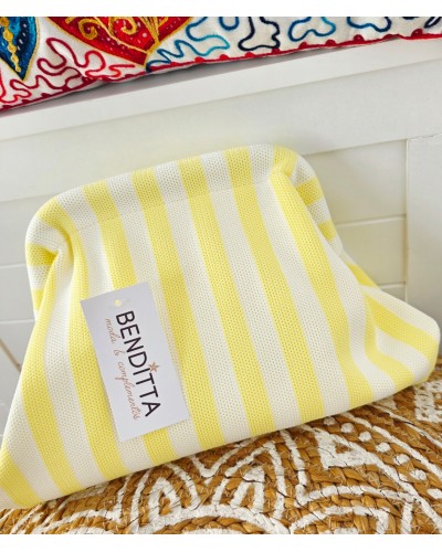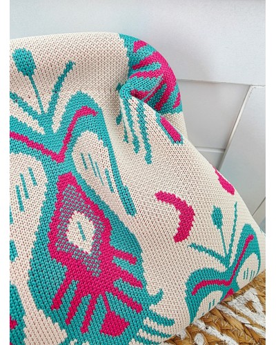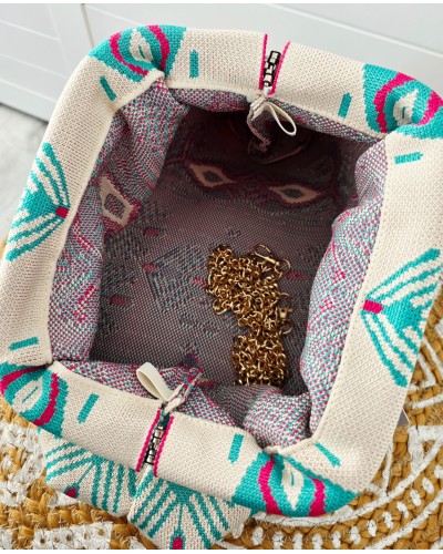 Bolso tejido con fondo en crudo y estampado en tonos turquesa y fucsia. Cierre a presión para llevar de mano. Incluye cadena larga dorada para llevar también colgado.