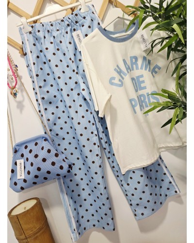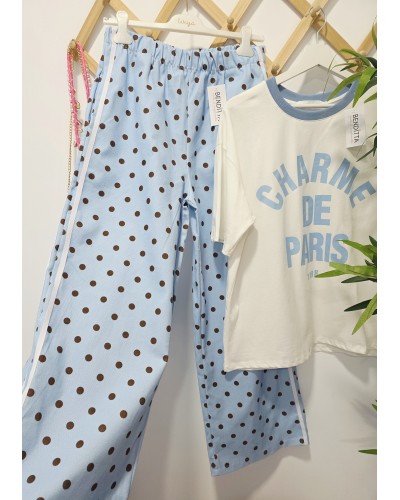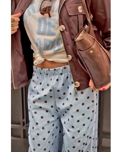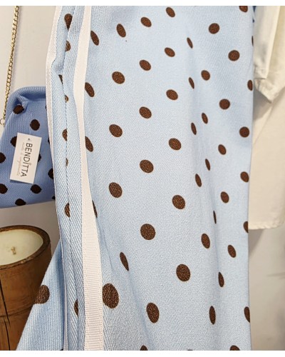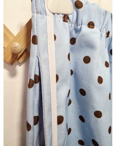 Jeans con corte ancho y goma elástica en cintura. En color azul celeste con lunares en marrón chocolate. Doble raya en color blanco en los laterales. Con bolsillos.