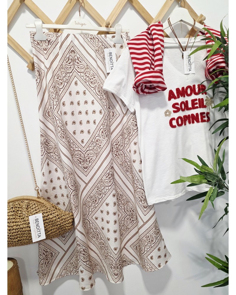 Falda de largo midi con estampado pañuelo bandana. Tonos beige, crudo, tostado.. Goma elástica en cintura. Con vuelo, quedan sueltas.