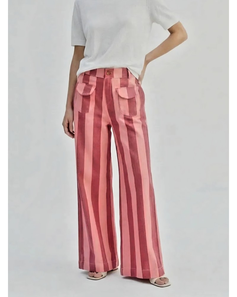 Pantalones con tejido vaquero suave. Estampado de rayas verticales en tonos rosas. Con botón y cremallera para su cierre y trasera elástica que se ajusta a varias medidas. Bolsillos delanteros con solapas. Corte recto anchito.