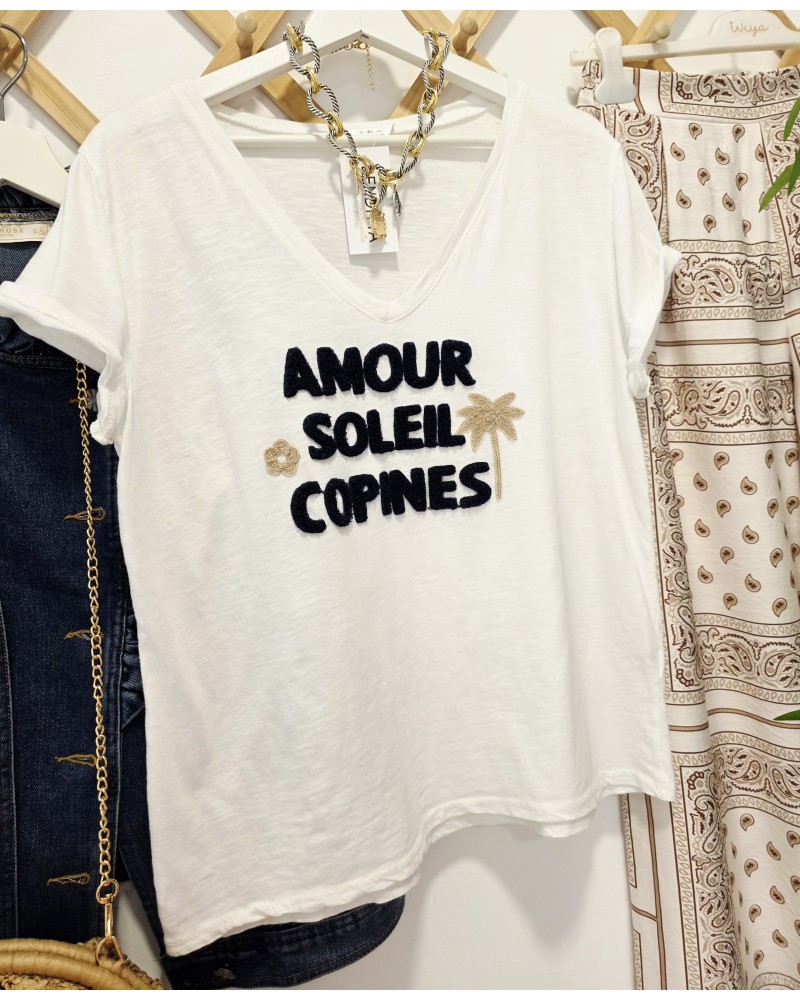 Camiseta en color blanco con cuello pico y manga corta. Detalle en parte delantera de texto y dibujo bordados en azul marino y beige..