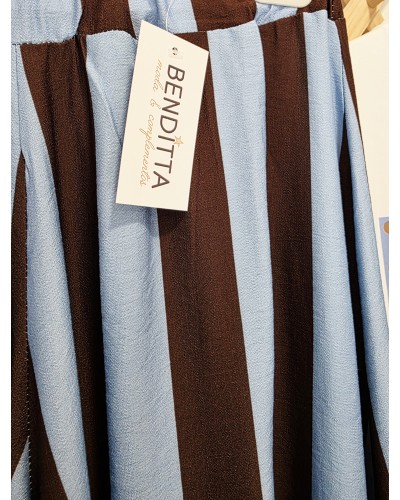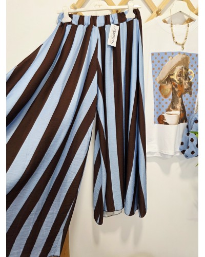 Pantalón con tejido fluido y corte ancho. Llevan goma elástica en cintura. Estampado de rayas verticales en azul celeste / marrón chocolate. Muy cómodos y fresquitos.